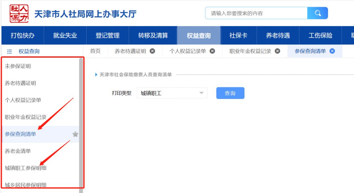 进入天津市社保局官网后,登录个人社保网上服务系统,然后点击“权益查询”—“参保查询”、”城职职工参保明细“等自己的社保详细信息。