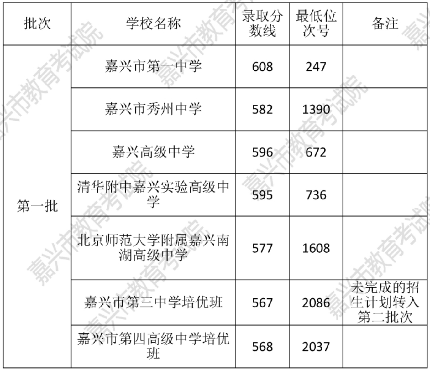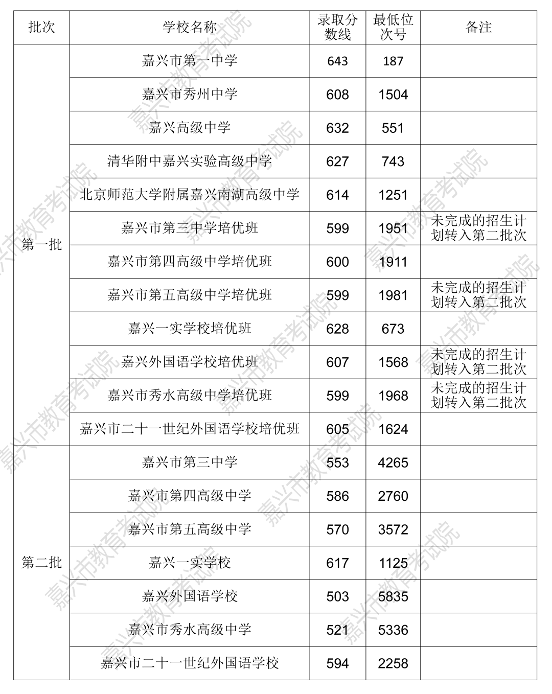 2024年嘉兴市本级普通高中招生各学校录取分数线