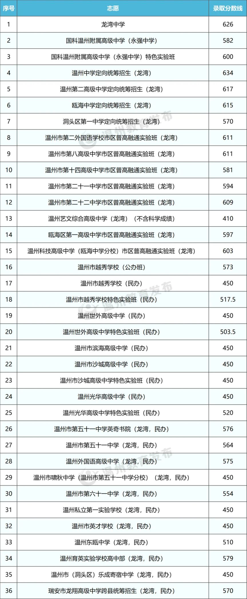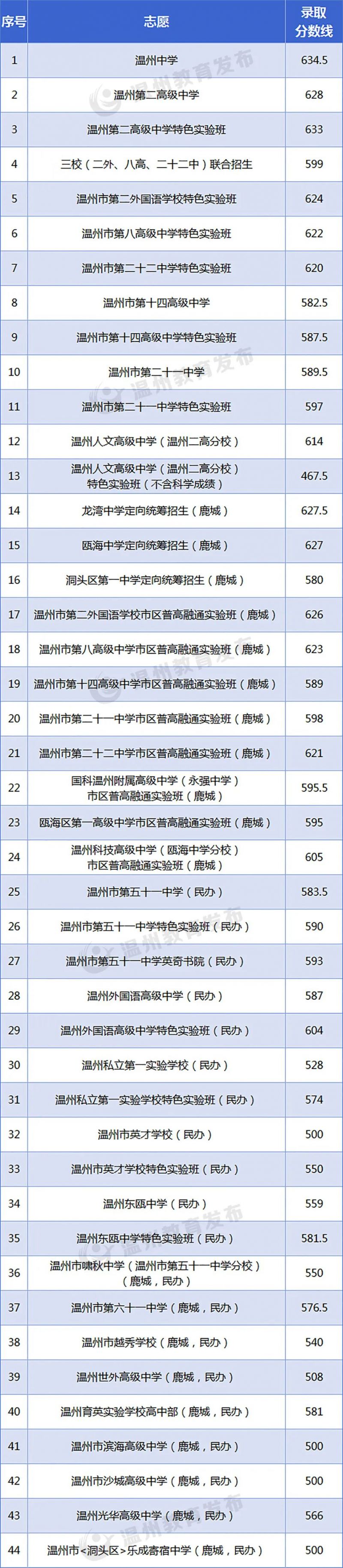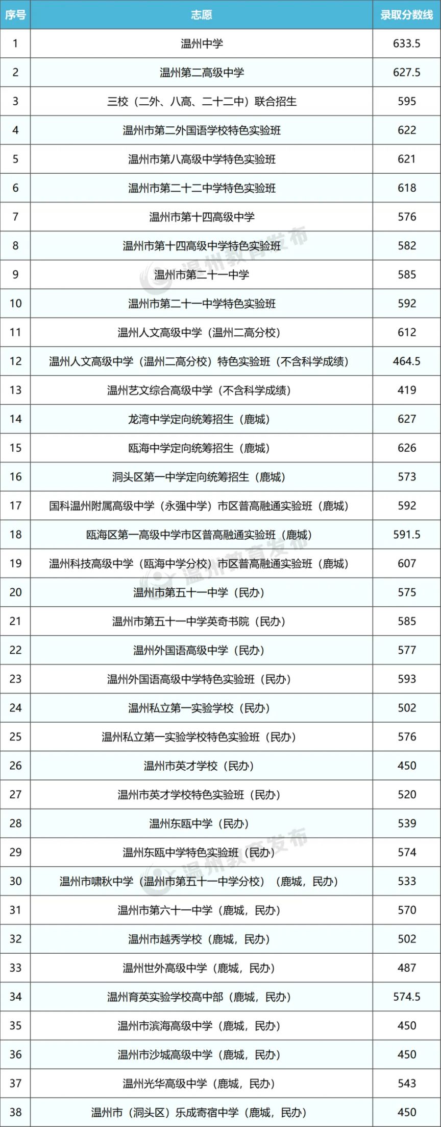 2023年温州市教育局直属普通高中志愿录取分数线划定。